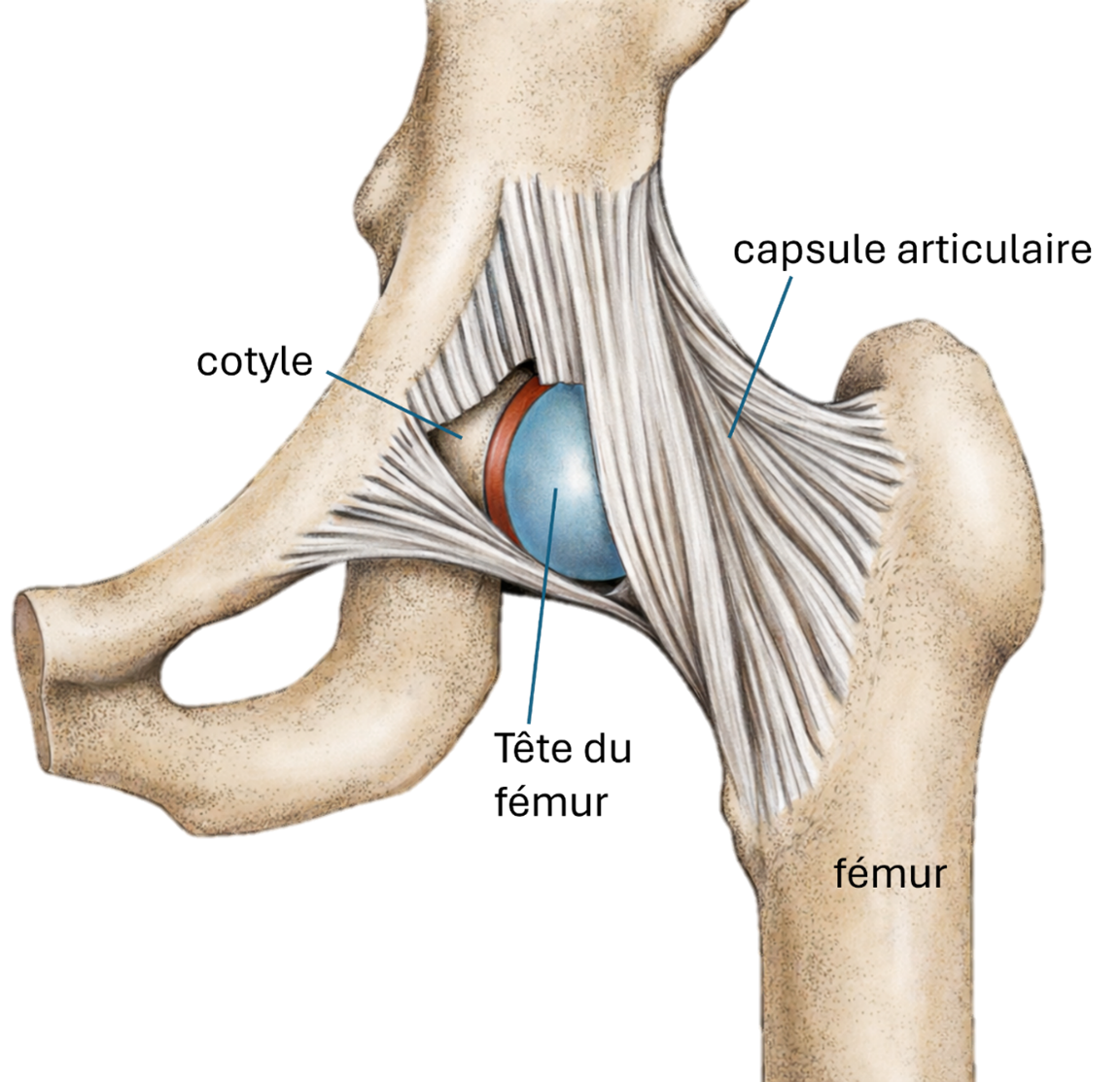 La hanche est une articulation entre la tête du fémur et le cotyle (partie du bassin).