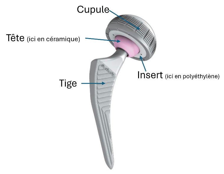 - Cimenté (PMMA médical), donnant une tenue immédiate dès la fin de l’opération.