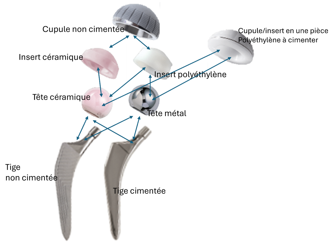 Les tiges cimentées sont en acier inox médical, aujourd’hui les cupules sont rarement cimentées, il existe des cupules cimentées entièrement en polyéthylène (l’insert et la cupule ne font qu’un) et des cupules en acier (nécessitant un insert) à cimenter.